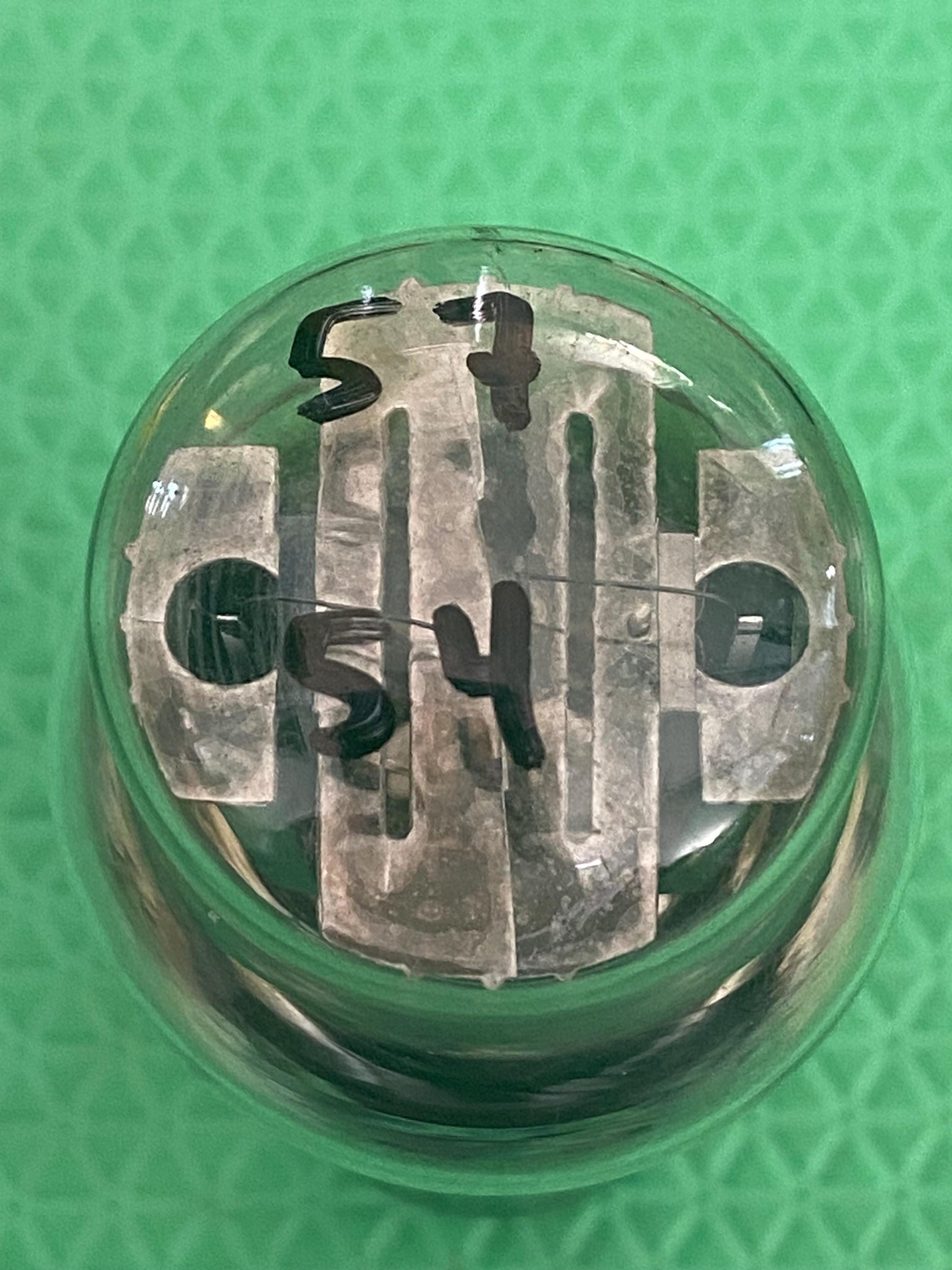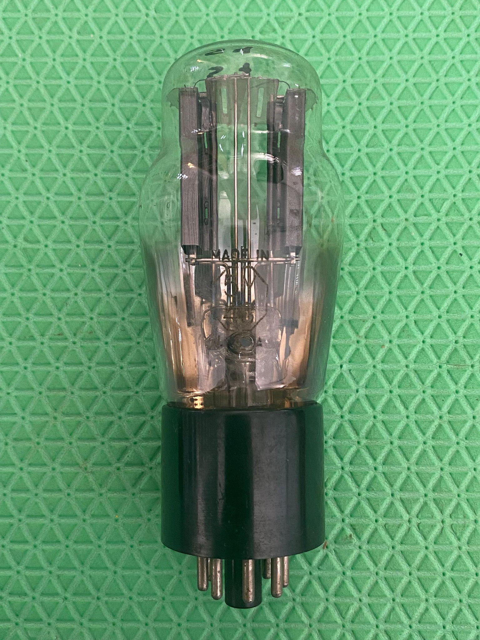 It has the nostalgic shoulder / Coke bottle glass envelope; hanging filaments; a phi-shaped, top mica spacer; an engraved base; a bottom, dimple, sheet getter; excellent flashing and smooth, black plates.
