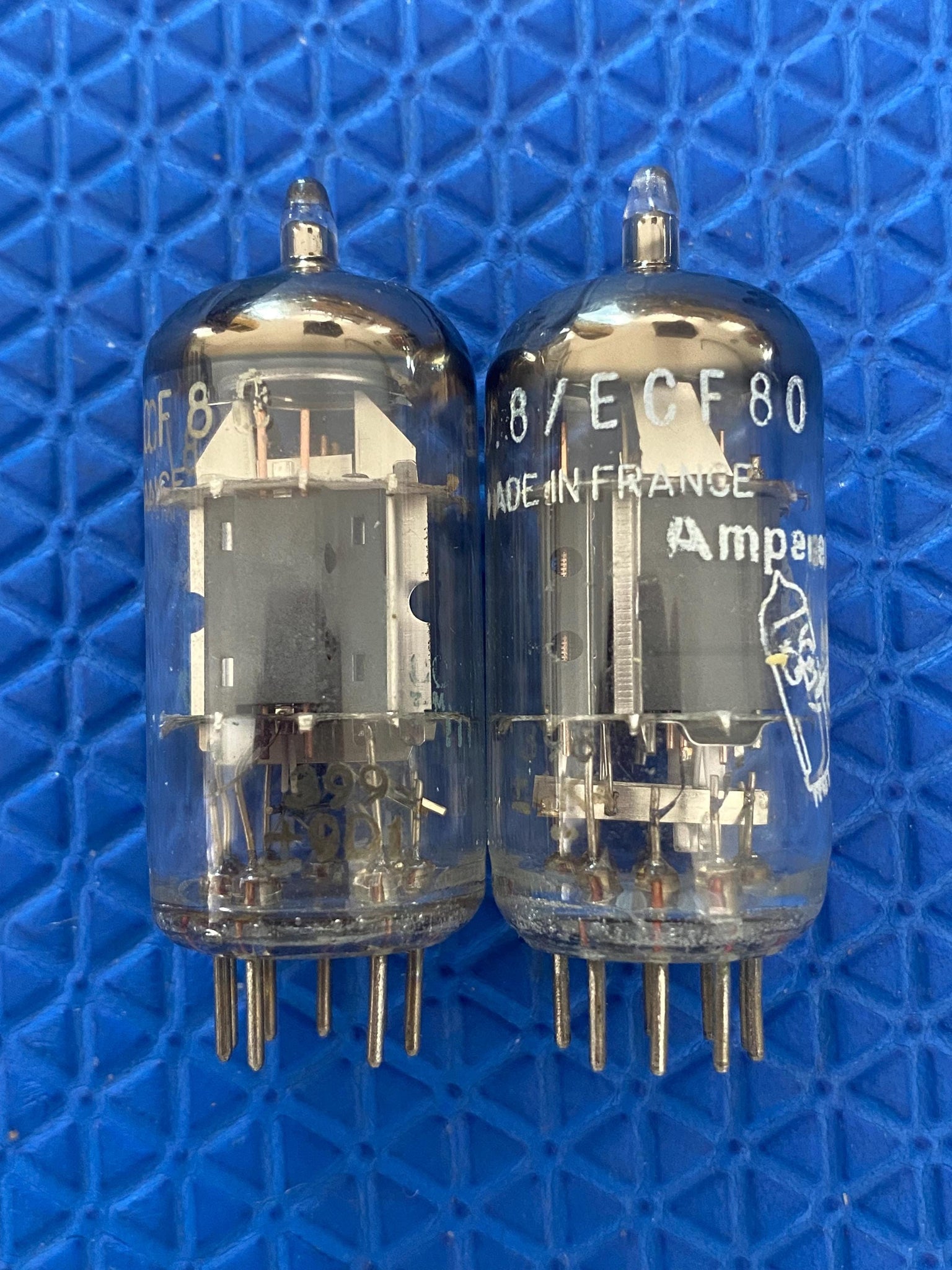 This matched pair of French Amperex 6BL8 pentode/triode tubes was tested on our Paul Hart-calibrated TV7/U for shorts, gas and transconductance. There were no shorts or gas.