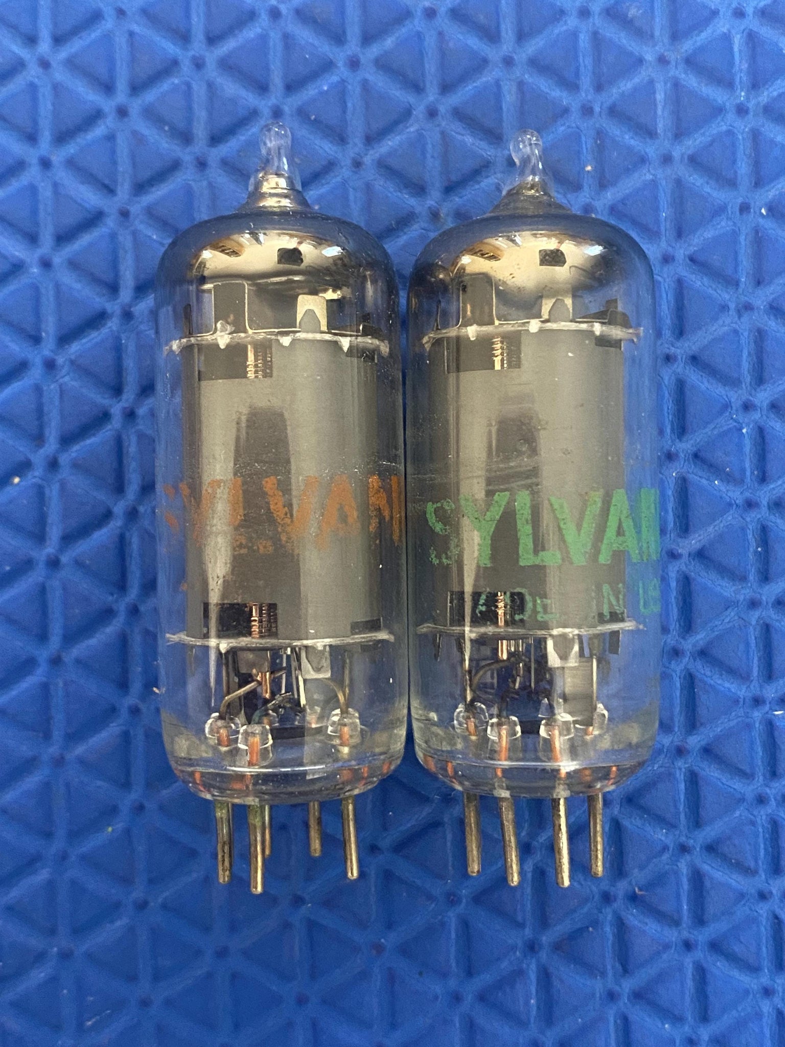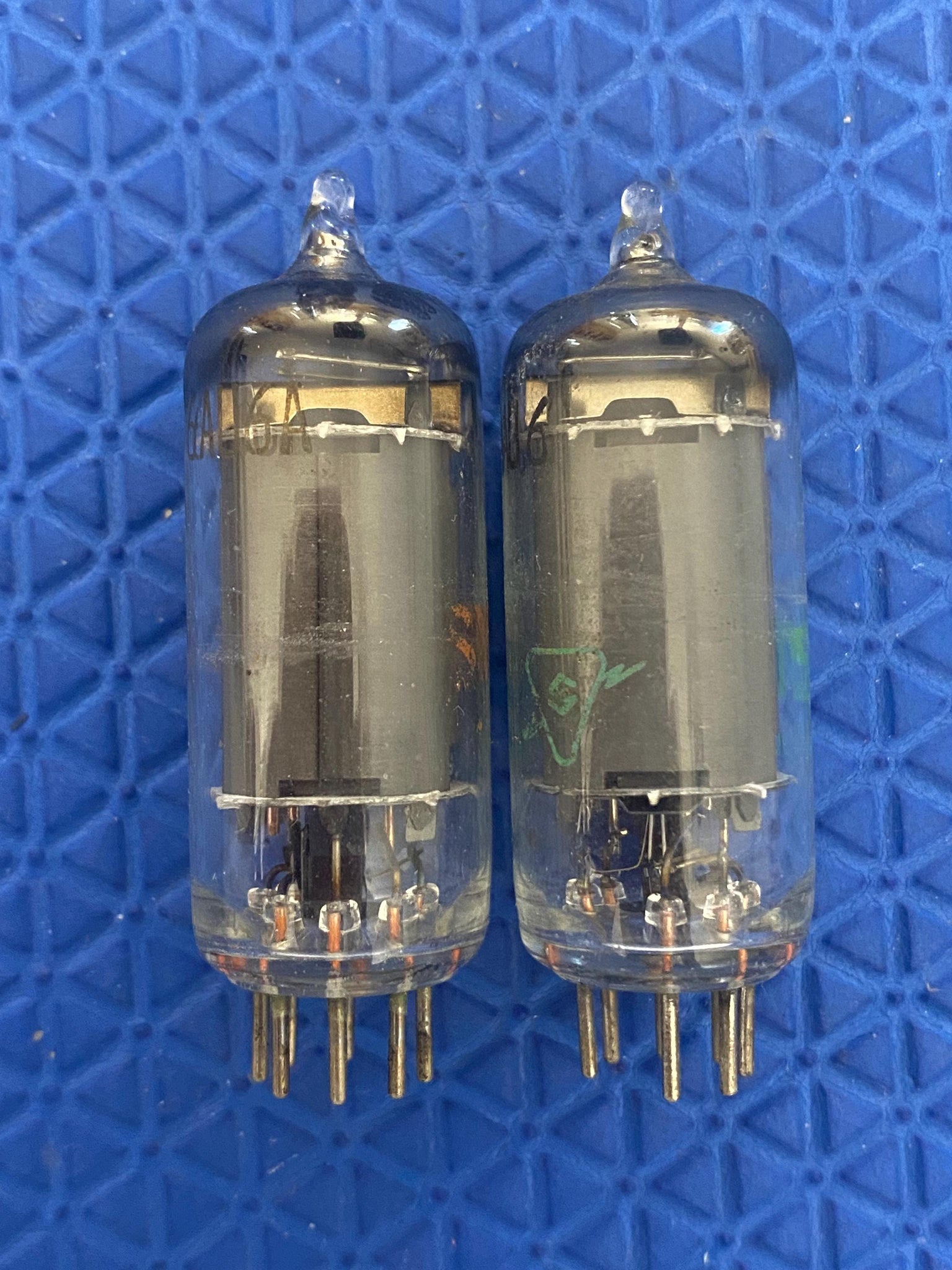 This new old stock-testing matched pair of Sylvania 6AU6 tubes was tested on our Paul Hart-calibrated TV7/U for shorts, gas and transconductance. There were no shorts or gas.