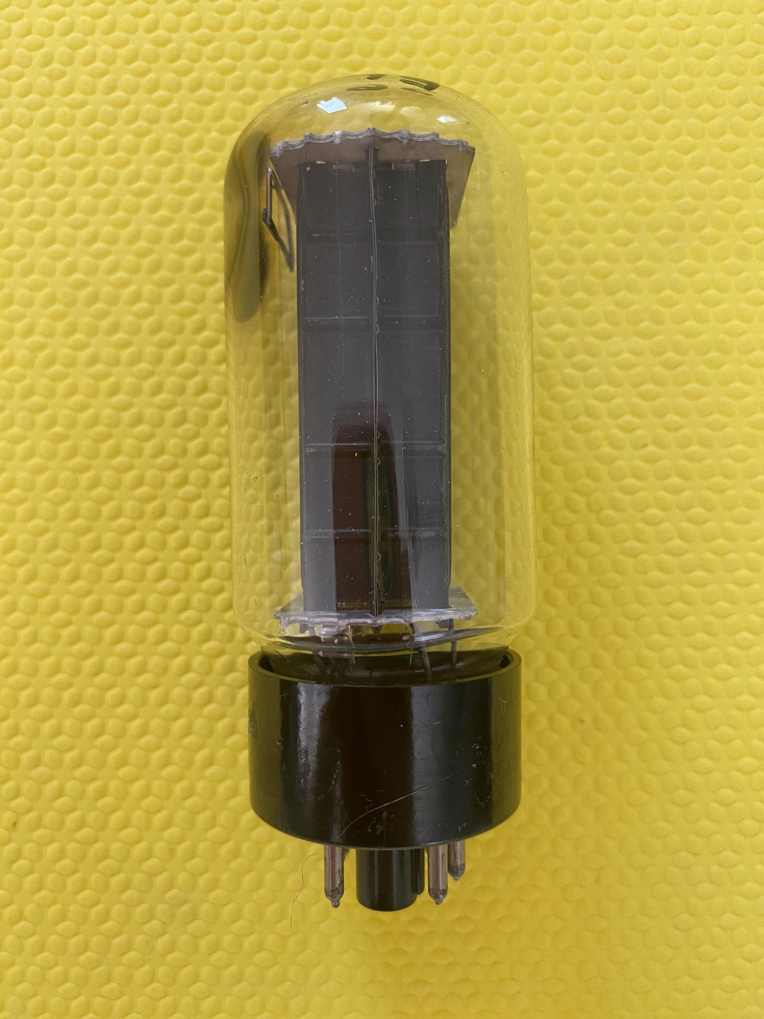 It has a top, side D getter; good flashing; black plates and crenelated rectangular top and bottom mica spacers.